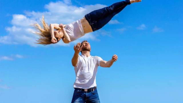 Un’esplorazione poetica della relazione tra due persone che si amano ma spesso non trovano il giusto equilibrio e il desiderio di controllo dell’altro prende il sopravvento. Rabbia e desiderio, fiducia e sorpresa si alternano come i corpi che volano nell’aria lanciati quasi fossero immuni alla forza di gravità. Questi corpi nell’aria si abbracciano e si respingono, si muovono all’unisono in un’atmosfera magnetica. Emozionante e unico, questo spettacolo esplora le fragilità, le contraddizioni e i desideri di una coppia, alternando eleganza, intimità e grande impatto visivo grazie alla capacità di intrecciare danza, atletica e acrobatica.